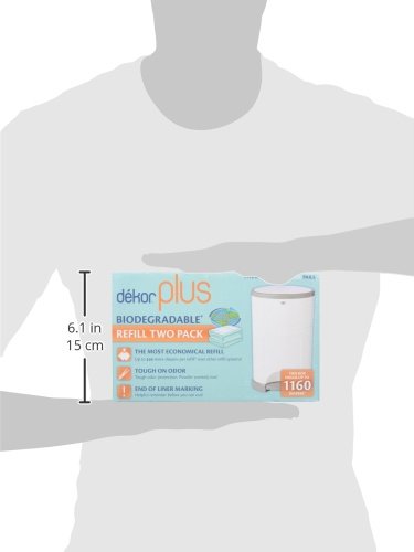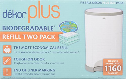 You will change your baby’s diaper 6,000-9,000 times in the next few years. Why not use a diaper pail designed to save you money on each one of those changes? Compared to other refill systems, Dekor Plus Refills use less of the refill per diaper than any other brand, making it the most cost-effective on the market. Each Dekor Refill is one long continuous liner with no preset perforations or size, which means you can empty the pail as often as you want—whether it’s after one particularly stinky change, or when the pail is totally stuffed—and use only as much refill as you need. Emptying the pail is super-easy. Simply cut the refill with the kid-safe cutter located inside the access door, discard, and tie a new knot in the remaining bag. Dekor refills are made of 20% recycled materials and infused with a fresh baby powder scent that helps neutralize odors. Dekor Biodegradable Refills break down more quickly than ordinary refills. As defined in ASTM 1991, "A Biodegradable Plastic is defined as a degradable plastic in which the degradation results from the action of naturally occurring microorganisms such as bacteria, fungi, and algae." Each box contains 2 refills and holds up to 1160 newborn diapers.Feature
