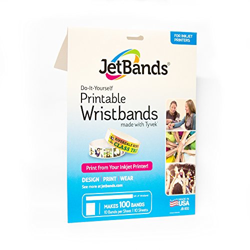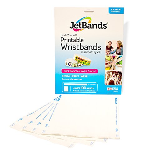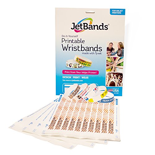 -. Feature : Easy, do it yourself custom Tyvek wristbands. P.R.Intable from any Inkjet P.R.Inter. / DESIGN - Easy instructions to create your own designs, plus free downloadable templates at JetBands.com / P.R.INT - Full color custom wristbands from your standard inkjet P.R.Inter. 100 wristbands. 10 per sheet, perforated for easy separation. / WEAR - Thousands of fun uses! Secure adhesive seal, water resistant and durable. Find more usage ideas at JetBands.com