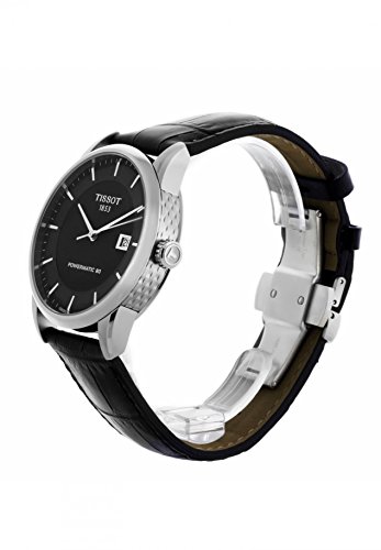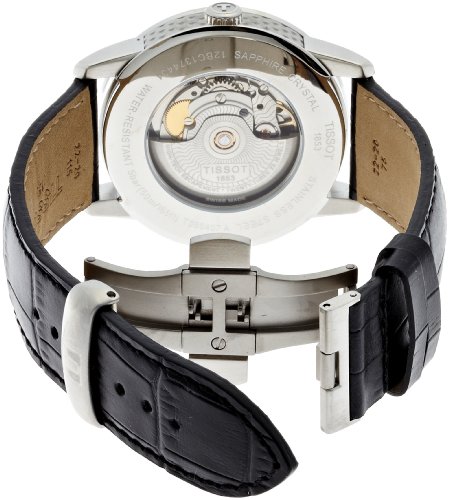 -. Feature : Tissot luxury automatic black dial black leather men's watch / Date display at the 3 o'clock position. Automatic movement. Powermatic 80 engine. Scratch resistant sapphire crystal. Skeleton case back / Swiss-automatic movement / Case diameter: 41mm / Water resistant to 165 feet