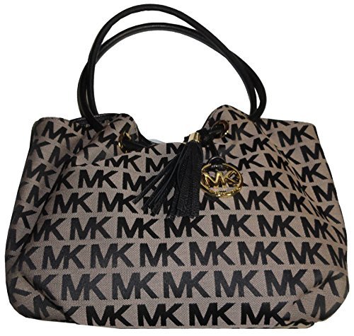 This mid-size East West Ring Tote from Michael Kors is wrapped in Michael Kors monogram block print on beige and black jacquard fabric and trimmed in black leather. It is accented with polished golden hardware including the removable Kors circular hanging charm on the front, and oversized tassel. It is lined in black Kors monogram printed fabric and features a zippered pocket and (4) open slip pockets. It has an open top with a tab and magnetic closure. The round rolled leather ring handles weave through golden tone grommets alone the upper edge, and have a 7 inch drop. The overall measurements are approximately 13 inches (L) x 9 inches (H) x 5 inches (W).Feature