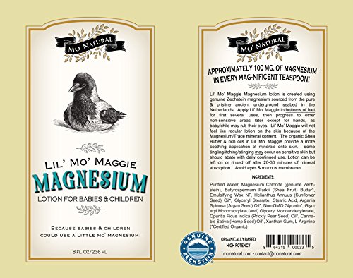 Many little ones are deficient in Magnesium - a vital mineral - even from birth! Every teaspoon of Lil' Mo' Maggie delivers approx. 100 mg. of Magnesium sourced directly from the ancient underground Zechstein seabed in the Netherlands - unpolluted, pristine purity! We have the highest standards & refuse to use ANY above-ground Magnesium source. Genuine Zechstein Magnesium is guaranteed to be free of Mercury, Lead, Arsenic, & Fluoride! Each batch is produced under strict GMP, ISO 9001, & ISO 14001 quality control standards. Above ground sources of Magnesium can be subject to mercury & many other pollutants, then highly processed as a result. Transdermal (onto skin) application is an OPTIMAL method for cellular mineral absorption. To our current much-loved formula, we've added even more of a mélange of opulent, luscious & EXTREMELY beneficial oils - all certified ORGANIC - to include Argan Seed oil & Prickly Pear Seed oil. They're non-comedogenic (won't clog pores), so Magnesium goes right to the cells where it's needed most! Our new preserving medium is ultra pure & approved by EcoCert, NPA & NaTrue standards! Aroma free! Use Lil' Mo' Maggie with confidence! **Many customers report that Lil' Mo' Maggie has a calming effect on their babies/children which was helpful at nap/bed time, during aggravation or hyperactivity. Also reported was pain/cramp relief. (**see disclaimer) IMPORTANT: Please remember that ALL minerals are a form of SALT, which means ANY brand of magnesium lotion can feel "different" on the skin (compared to normal body lotion). We blended organic luxury oils & Shea Butter with Magnesium to create Lil' Mo' Maggie, providing a more soothing application of minerals directly to the skin. In sensitive little ones or those with greater mineral deficiencies, some tingling/itching/stinging MAY occur. This can be a very average reaction with ANY dermal magnesium product & will abate with continued use. PLEASE read important instructions below!Feature