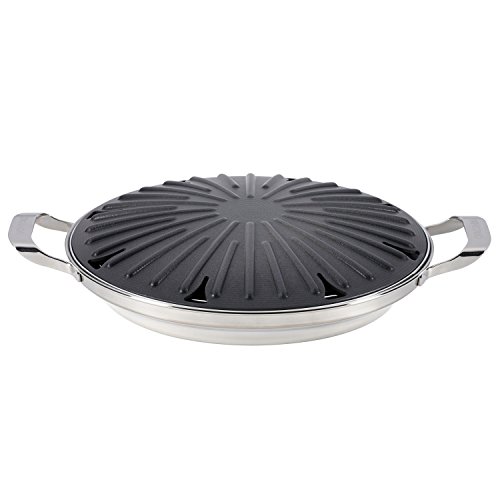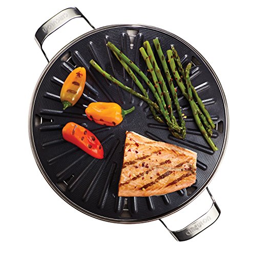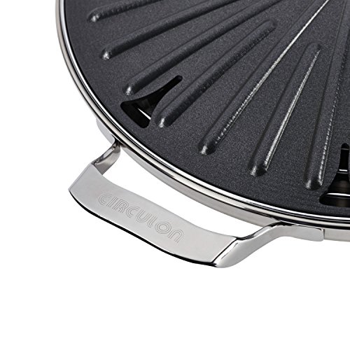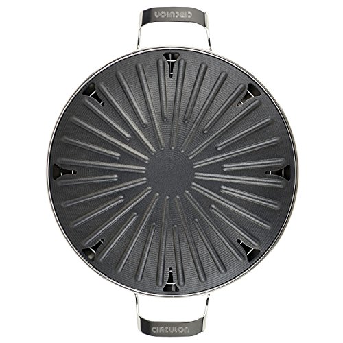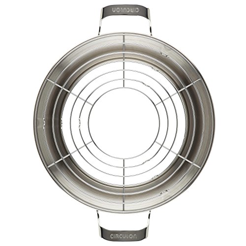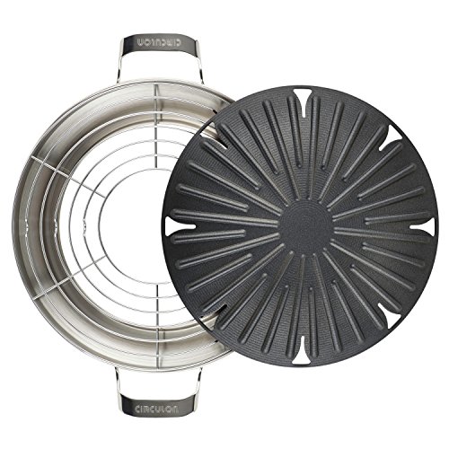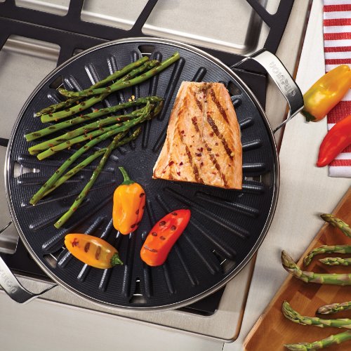 Enjoy delicious grilled foods indoors any time of year with the Circulon Hard-Anodized Nonstick 12-Inch Round Stovetop Grill with Accessories. Make a variety of healthy barbecued dishes, from farmer's market vegetable kabobs to wild salmon fillets with this handy stovetop set that includes a grill plate, drip tray and chrome wire rack. Hard-anodized construction provides fast, even grill heating and helps to reduce hot spots that can burn food. The grill plate features the TOTAL Food Release System of circles with PFOA-free DuPont Autograph nonstick on elevated circles that help preserve the nonstick for wonderful staying power, exceptional food release and an easy way to keep meals lower in fat - plus it's safe for use with metal utensils. Both the stainless steel drip tray featuring comfortable dual-riveted stainless steel handles and the wire rack are stylishly designed and dishwasher safe. For convenience, this round stovetop grill is oven safe to 500 Degree F and a great complement to many other pieces in the Circulon collections, all with superior nonstick technology. Bring the grilling indoors and create delicious and healthy meals with the Circulon Symmetry Hard-Anodized Nonstick 12-Inch Round Stovetop Grill with Accessories.Feature