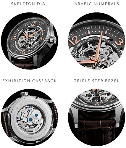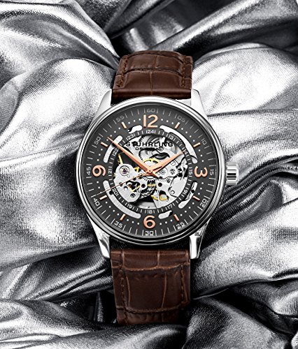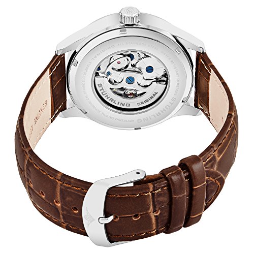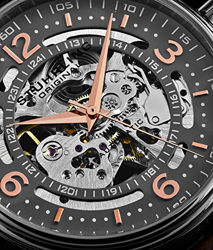 Intended for the man with discriminating taste, Stuhrling Original's Denmark watch, with its alligator-embossed leather strap, stainless steel knurl-edge crown, and intricate skeleton face and back, is like no other. Automatic self-winding movement with analog display Protective Krysterna crystal dial window on front and back Features include gray face plate with inner dial 24-hour counter and rose-tone numerals with outer minute track Water-resistant to 50 m (165 feet)Feature