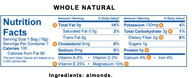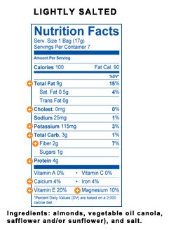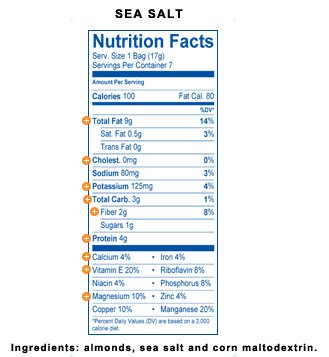 -. Feature : 14 / .6 oz. small bags WHOLE NATURAL Almonds / 14 / .6 oz. small bags LOW SODIUM Almonds / 14 / .6 oz. small bags Oven Roasted Almonds WITH SEA SALT / Total of 42 small grab and go bags, 100 Calories Packs / 3 ASSORTED FLAVORS