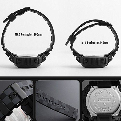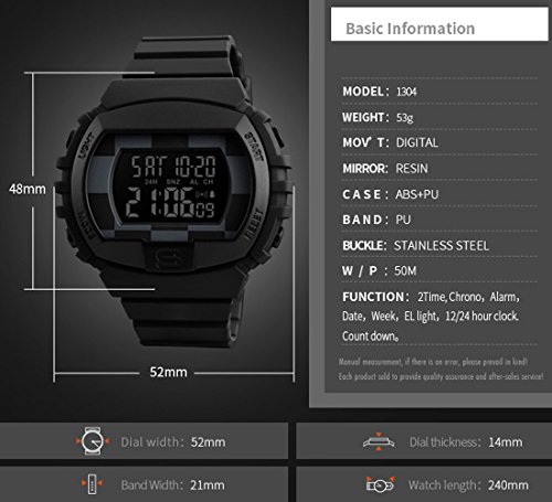 세트내용:디지탈 손목시계+오리지날박스 사양:케이스크기:약52x48mm 케이스 두께:약14mm 밴드폭:21mm 밴드장:약240mm,145-200mm에 조절 가능 본체 무게:약53g