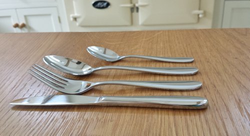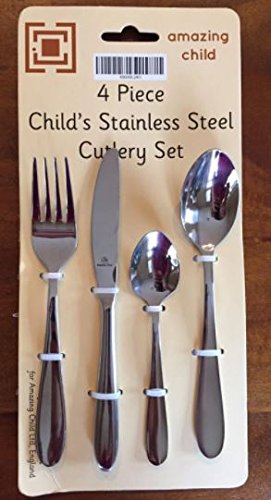 Product Description 2 x Beautiful four piece quality stainless steel cutlery / flatware set comprising a childsized knife, fork, spoon and teaspoon. 18/0 Stainless Steel. Knife length = 6 3/4" (17cm) , Fork / Spoon = 6 1/4" (16cm) , Teaspoon = 4 3/4" (12cm). Sizes are approximate. AMAZING CHILD branded packaging 0