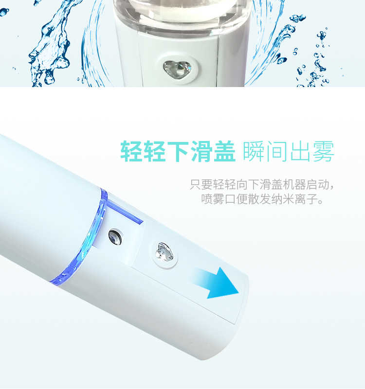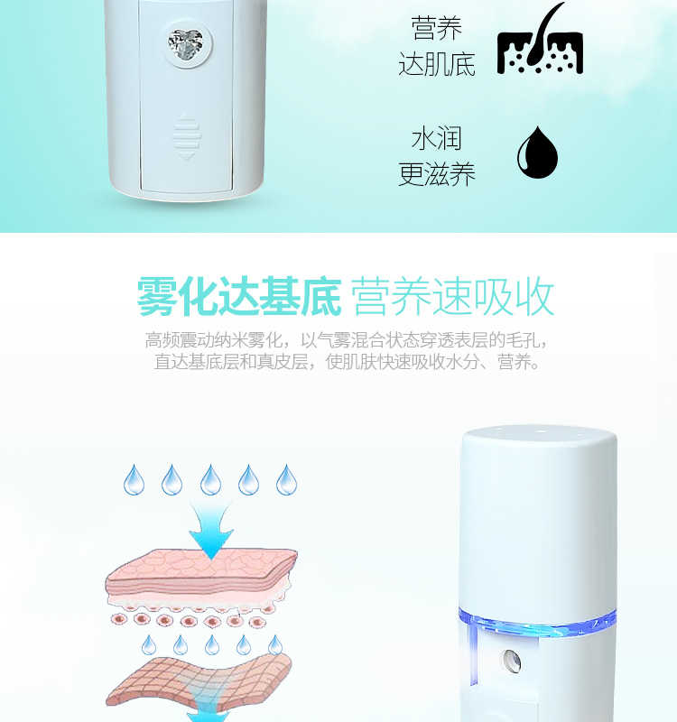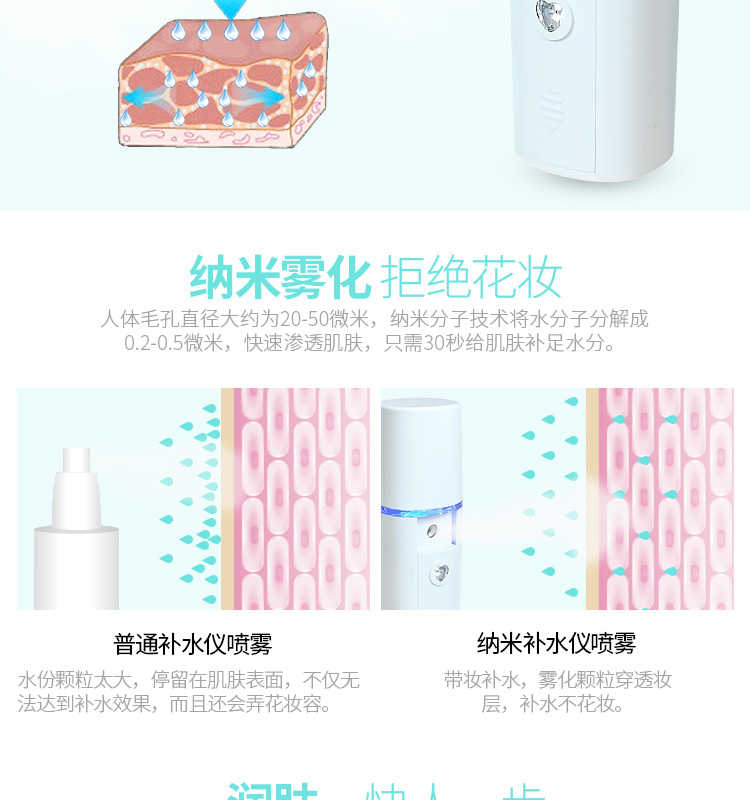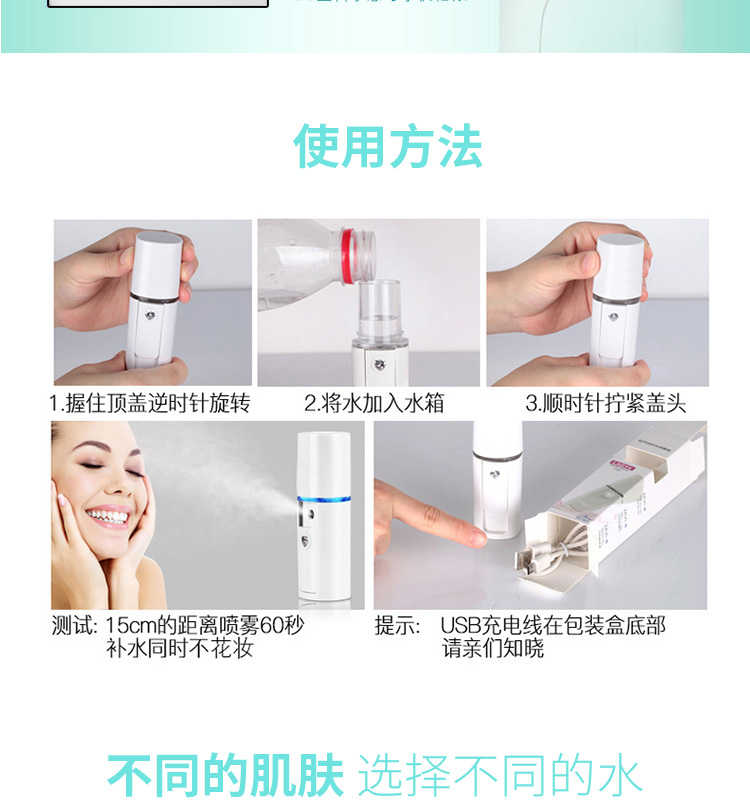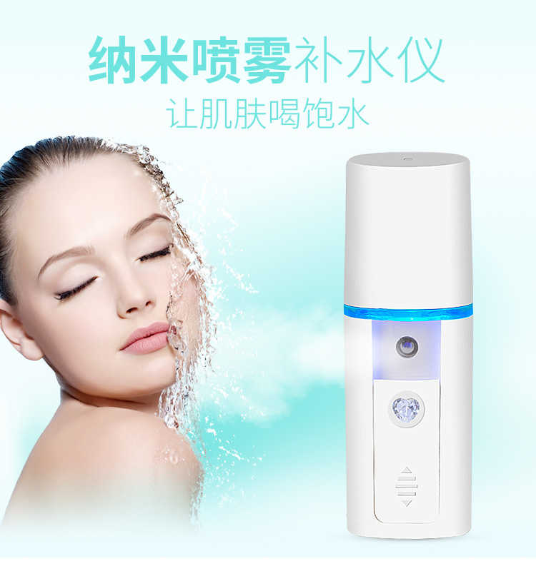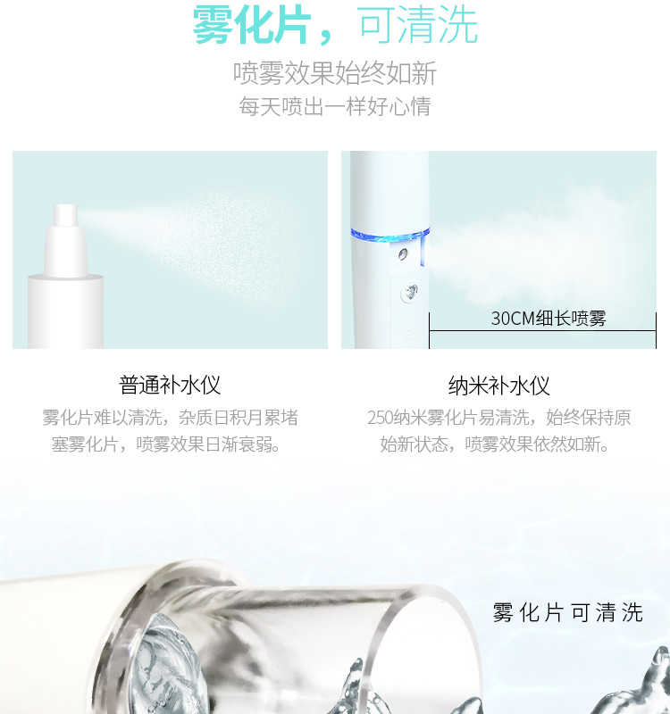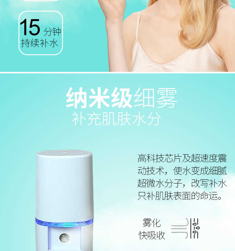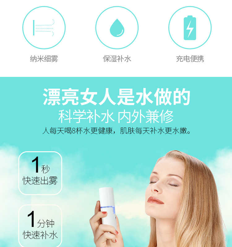 补水神器,每一天给肌肤补充充足水分,横扫你的肌肤烦恼,便携式纳米离子喷雾剂,每次喷出百万颗纳米级水分子,平均渗透肌肤直达肌肤底层,深层补水。