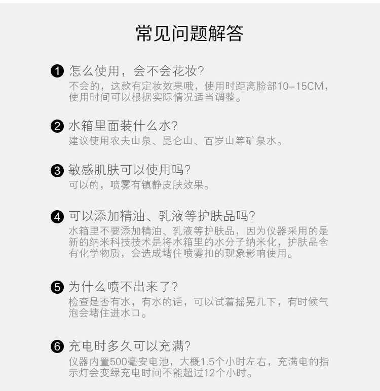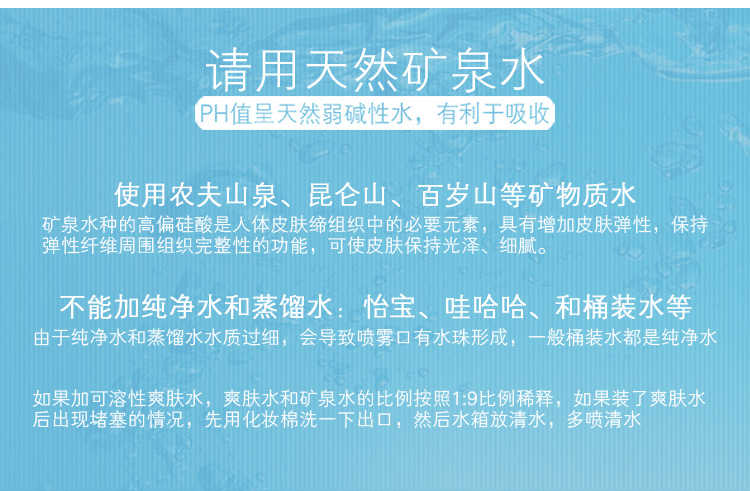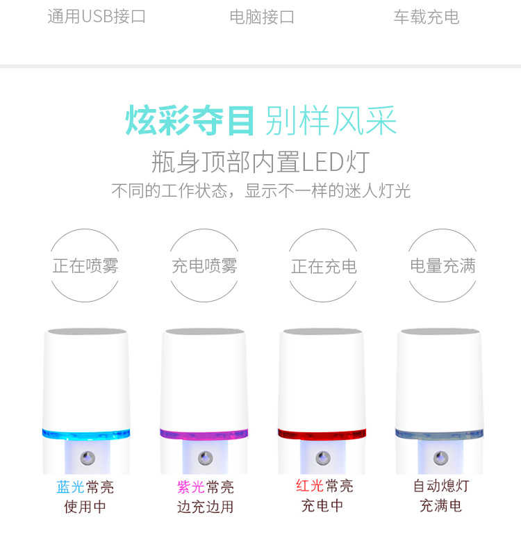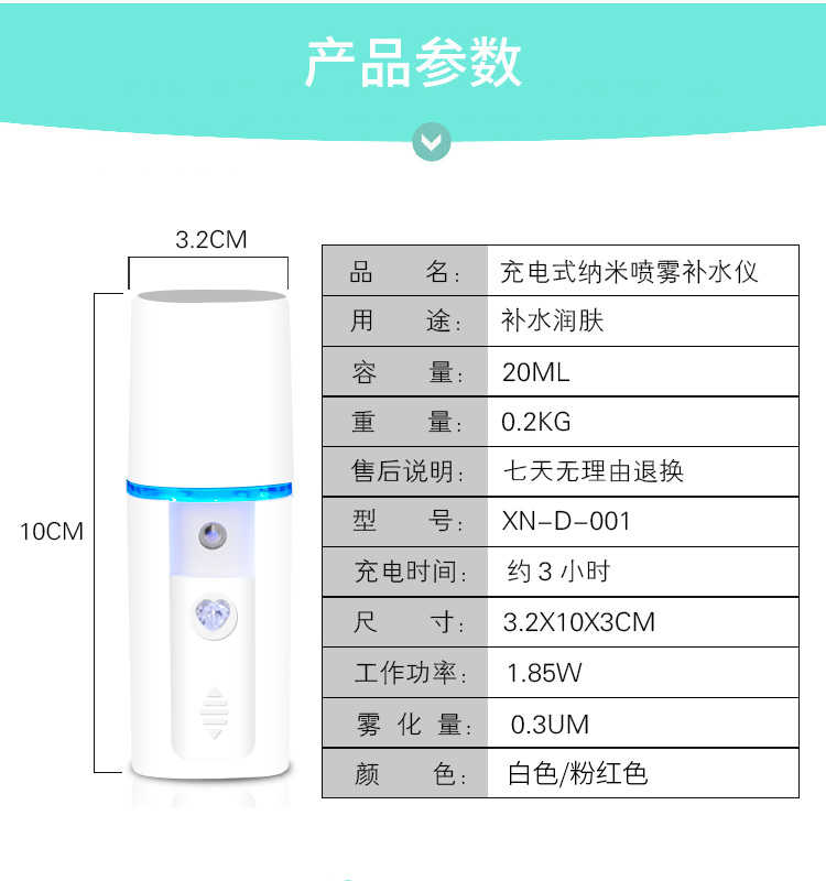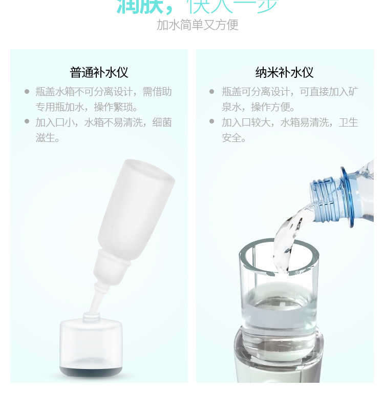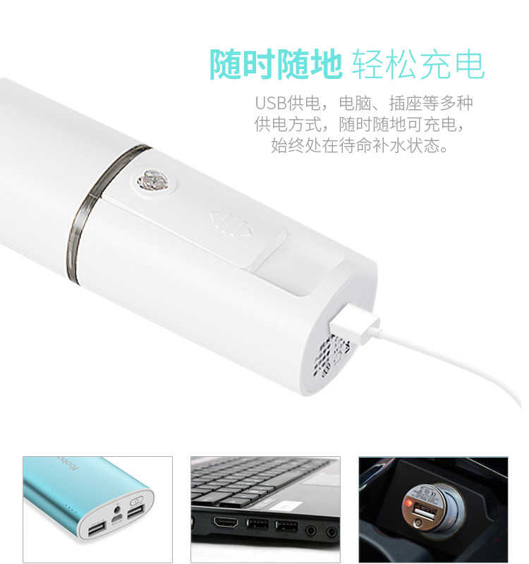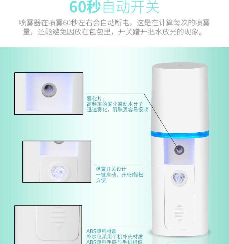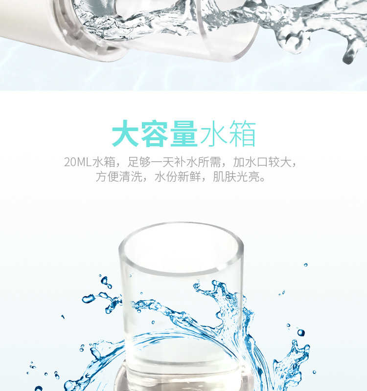 补水神器,每一天给肌肤补充充足水分,横扫你的肌肤烦恼,便携式纳米离子喷雾剂,每次喷出百万颗纳米级水分子,平均渗透肌肤直达肌肤底层,深层补水。