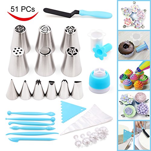 Joiedomi 51 Pieces Cake Icing and Decorating Kit Including 12 Stainless Steel Icing Tips, 25 Disposable Decorating Bags, Tri Color Coupler, Icing Spatulas, Icing Smoother, Cupcake Corer and More