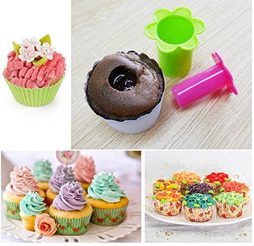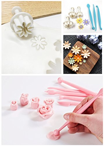 - Also includes a dual size Cupcake Corer, Icing Spatula, Triangle Icing smoother, 6 pieces Flower Modeling tool, 3 pieces Flower Fondant Cake Plunger Decorating Molds.