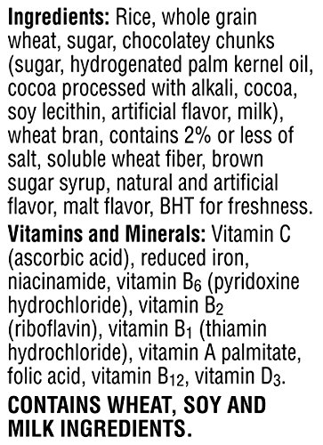 Feature : 120 calories per serving / Good source of fiber / Crunchy rice and wheat flakes with chocolatey pieces / Made with whole grain