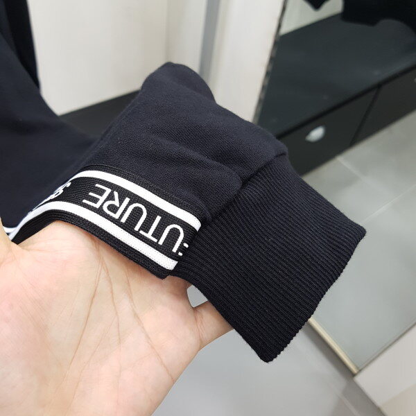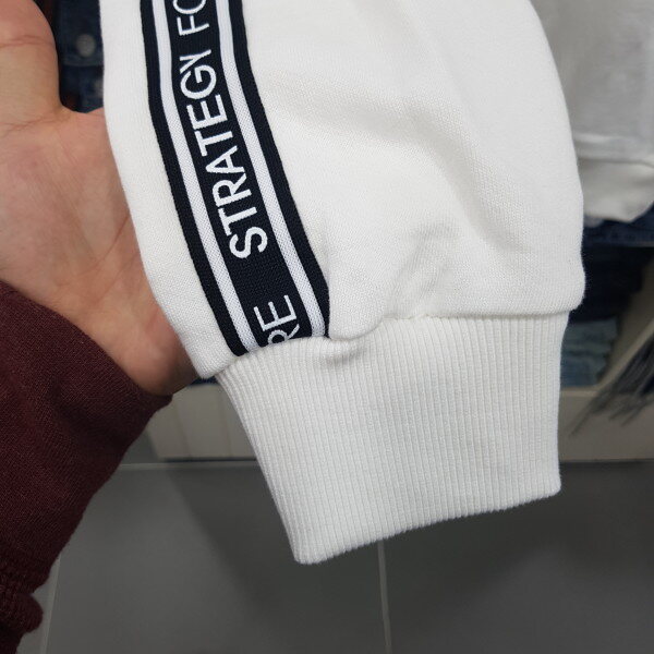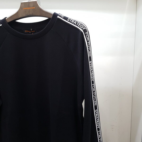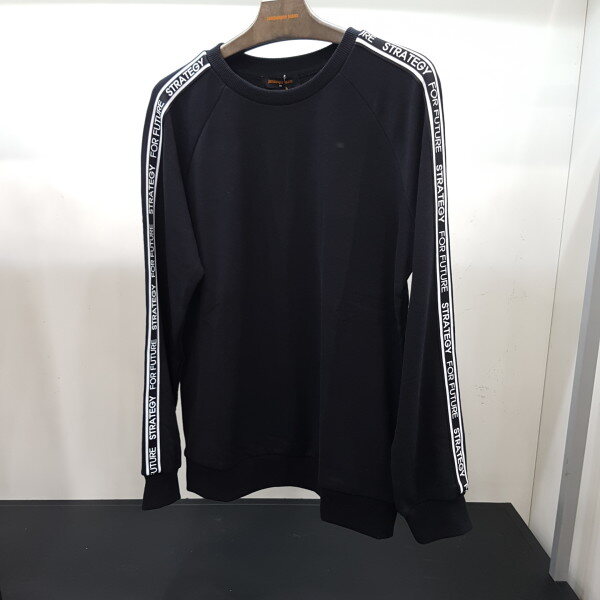 팔 양옆에 테이프 흰선 프린팅으로 인해 포멀한 느낌을 주는 맨투맨입니다.