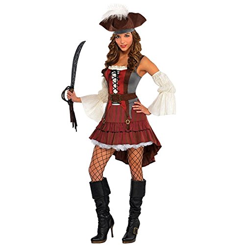 -. Brand : Amscan -. Color : Pirate -. Department : womens -. Feature : Our Castaway Pirate Costume turns the plank into a catwalk / This high-quality and comfy high-low stretch dress features a corset-inspired lace-up bodice / This package includes: (3 Pieces) A dress, a hat, and white sleevelettes / Family and friends of all ages will adore this costume / Great for Halloween or any costume party -. ProductGroup : Apparel -. ProductTypeName : ADULT_COSTUME -. Title : Womens Castaway Pirate Costume