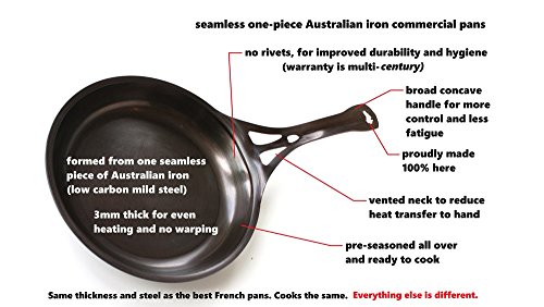 The 7" (18cm) Skillet With Smooth Finish by AUS-ION is 100% made in Sydney from one seamless piece of 3mm thick Australian sheet iron. A traditional fry pan for smaller jobs, with 2" high sides. AUS-ION cookware is built to last with all of the features and details professional chefs look for in a pan: high quality, comfortable to use and easy to clean. The seamless, one-piece construction means there are no rivets, so there is nothing for food or steel wool particles to get caught in. The handles are ergonomically designed with a wide, concave shape which is more comfortable to use with better control and less hand fatigue. And the generous venting in the handle neck reduces heat transfer for a cooler handle. The pans cook like cast iron but are lighter weight, they heat evenly and will not warp. The entire pan is naturally pre-seasoned for a healthy nonstick option; It is not coated like many steel pan brands, so it arrives ready to cook, no stripping necessary. AUS-ION pans are suitable for use at high heat over any heat source. For best results, follow our instructions. To clean: after cooking, use a wooden utensil or steel wool to gently scrape pan under hot running water. It is best to clean while the pan is still very warm. If necessary, you may use a brush, but be careful not to take off too much of that beautiful seasoning that you have built up! Do not use soap, as it will erode the seasoning. Dry thoroughly with a paper towel while the pan is still warm. If the pan is still relatively new, return to the stove top and wipe the interior of the pan with a small amount of oil, heat until smoking. Then, using tongs, wipe off the excess oil.Feature