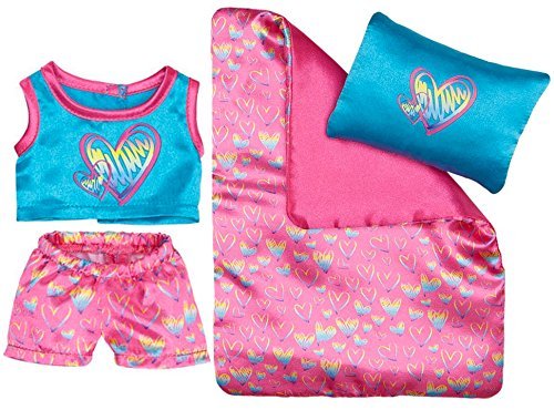 -. Feature : Build a Bear Buddies Smallfrys 2 Pc. Heart PJs with Matching Pillow Comforter Bedding Set / Fits 7 inch Mini Stuffed Plush Toy BAB Animals / Your favorite mini stuffed animal will have the sweetest of dreams with these satiny pink heart PJs. Includes a turquoise tank top with heart graphic and pink trim, and all-over-heart P.R.Int bot / Tuck your favorite mini furry friend into bed with this heart bedding set that is the pawfect size for them! Includes a pink comforter with heart P.R.Int and matching turquoise pillow / Ages 3+