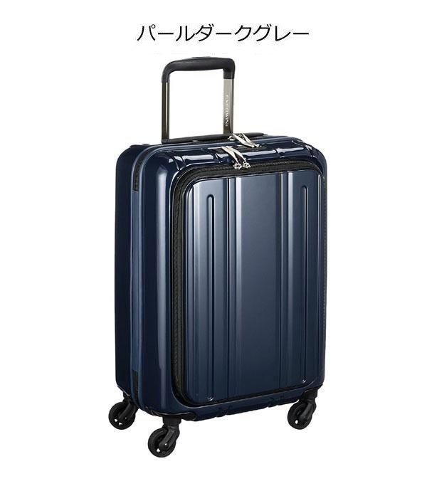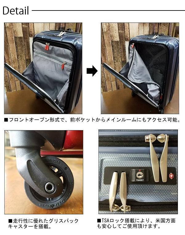 | フロントオープン式ファスナーキャリーです。「軽く、静かに、大容量」をテーマに、理想のスーツケースを追求しました。100席以上の国内線機内持込みサイズに適合した、小型でコンパクトな設計となっています。走行性を考慮した静音50mmの大型4輪グリスパック「HINOMOTO」キャスターを採用。フロントオープンポケットから、本体内部にアクセスが可能な点と、内部は仕切りやファスナーポケットなど、機能面も充実しています。 |