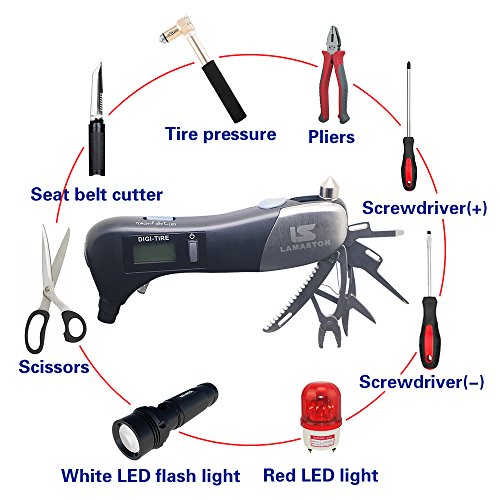Car Safety Hammer 9 in 1 Multifunction Hammer Tool With LED Flashlight, Digital Tire Pressure Gauge,Red LED Light,Safety Hammer,Seat Belt Cutter,Scissors,Screwdriver(-)&(+),Pliers,LAMASTON