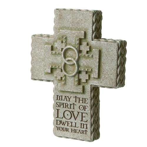 - Irish, celtic, old world design theme cross with message that reads "May the spirit of love dwell in your heart"