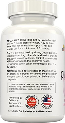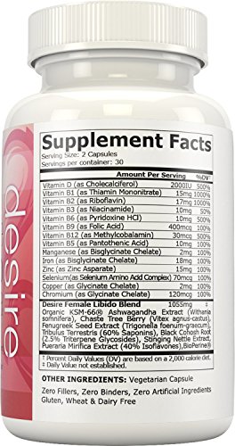 - Feature : Natural Herbal Extracts & Drug-Free Ingredients Clinically Researched to Improve Libido and Sex Drive. / Organic KSM-66® Ashwagandha, Chaste Tree Berry, Fenugreek Seed, Tribulus Terrestris, Black Cohosh, Stinging Nettle, and Pueraria Mirifica to Support Sexual Wellness. / Promote Healthy Drive, Boost Energy, and Improve Hormonal Balance Using Key Ingredients to Enhance Sex. / Pure Formula 100% Vegetarian Capsules Free of Gluten, Wheat, and Dairy with Zero Fillers, Zero Binders, and Zero Artificial Ingredients. Made in the USA to Strict FDA Standards by cGMP Certified Laboratory. / Try Desire risk-free! Backed by Our No Questions Asked, 90-day 100% Money Back Guarantee!