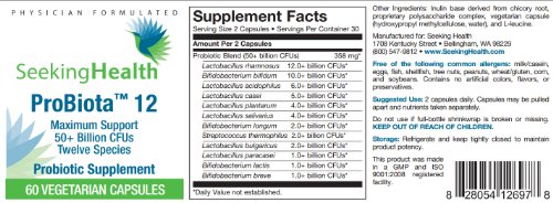 -. Binding : Health and Beauty -. Brand : Seeking Health -. EAN : 0828054126978 -. Feature : ProBiota 12 by Seeking Health is a potent multispecies probiotic that provides 50+ Billion beneficial microorganisms per serving. / IMPORTANT: ProBiota 12 is manufactured for and sold exclusively by Seeking Health. We DO NOT recommend purchasing this formula from any supplier other than Seeking Health on Amazon.com. / May support digestive and immune health, by supporting the growth of / Free of common allergens. Does not contain: milk/casein, eggs, fish, shellfish, tree nuts, peanuts, wheat/gluten, corn or soybeans. Contains no artificial flavors, colors or preservatives. -. Label : Seeking Health -. Manufacturer : Seeking Health -. Model : 023-05-001-06 -. MPN : PBIOTA-60-CAPS -. PartNumber : PBIOTA-60-CAPS -. ProductGroup : Health and Beauty -. ProductTypeName : HEALTH_PERSONAL_CARE -. Publisher : Seeking Health -. Studio : Seeking Health -. Title : ProBiota 12 Capsules | 60 Vegetarian Capsules | Broad-Spectrum Probiotic Support | 12 Strains | 50+ Billion CFU's per Serving | Physician-Formulated | Seeking Health -. UPC : 828054126978