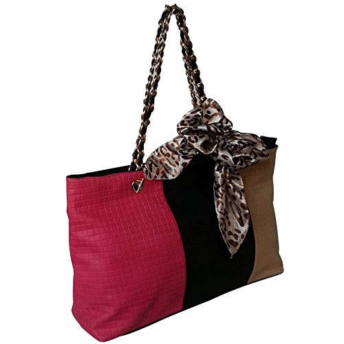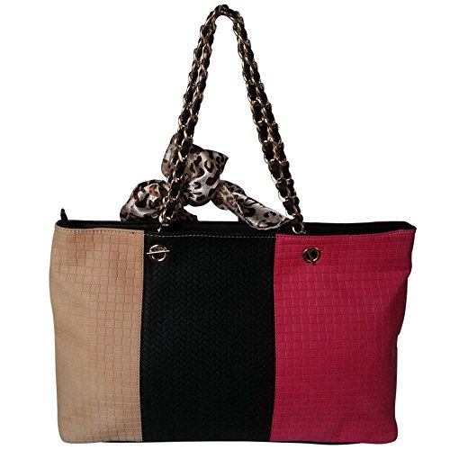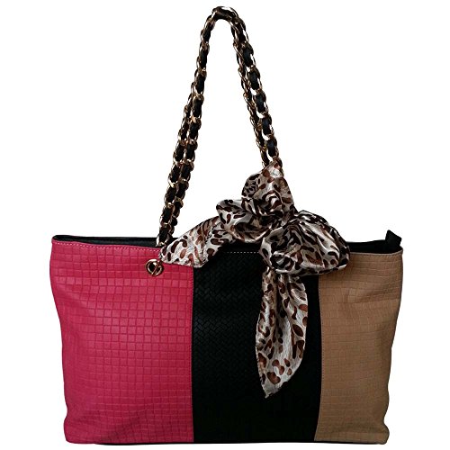 FASH Tri-tone Woven Pattern Embossed Tote Shoulder Handbag with Quilted Chain Strap,Pink,One Size