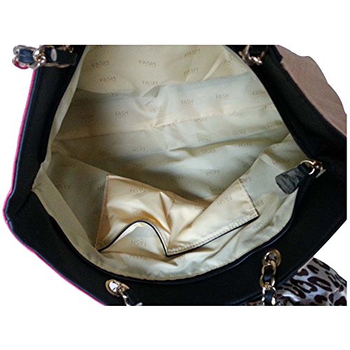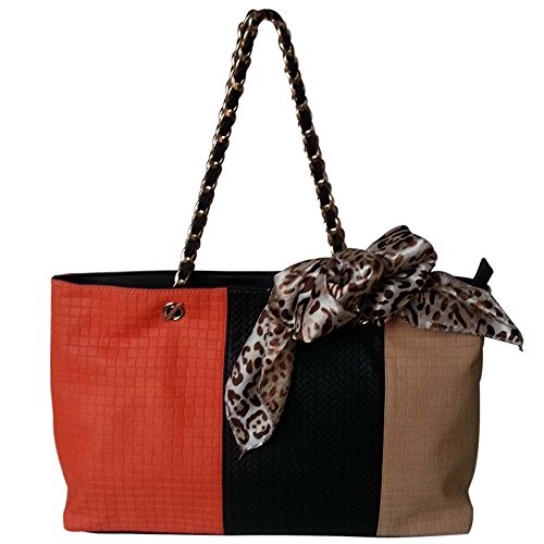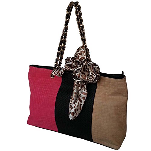 Add a little flash, a little fun, and a little color to this summer with this bold and trendy, Tri-tone Woven Pattern Embossed Tote Shoulder Handbag. Just one look is enough to make a woman in love with bright and colorful handbag. Made using man made leather this incredible handbag has a multicolored and textured exterior body. Its dual carrying metallic gold-toned handles with a Leatherette Strip twisted around it and the animal printed satin bow tied around it adds a glamorous touch to it. Slide the top zipper to revel its strong and fully lined interior which has the logo "FASH Limited" over the entire inner lining. This bag comes with 1 zippered and 2 open pockets, which can be used for storing small essentials such as your house and car keys, coins etc. If you are looking for a colorful handbag, then look no more as this is all you need.