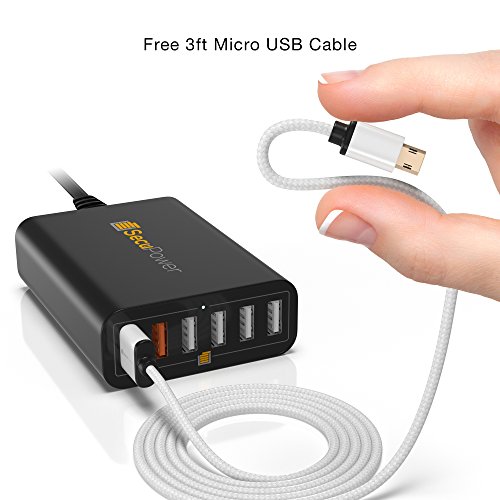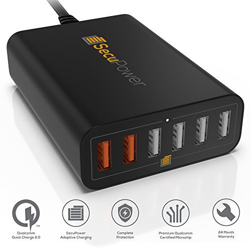 SecuPower 60W 6 Port Desktop USB Charger With 2 [Qualcomm Certified] Quick Charge 2.0 & Smart Ports For Auto Detection - FREE Micro USB Cable & Stand (Black)