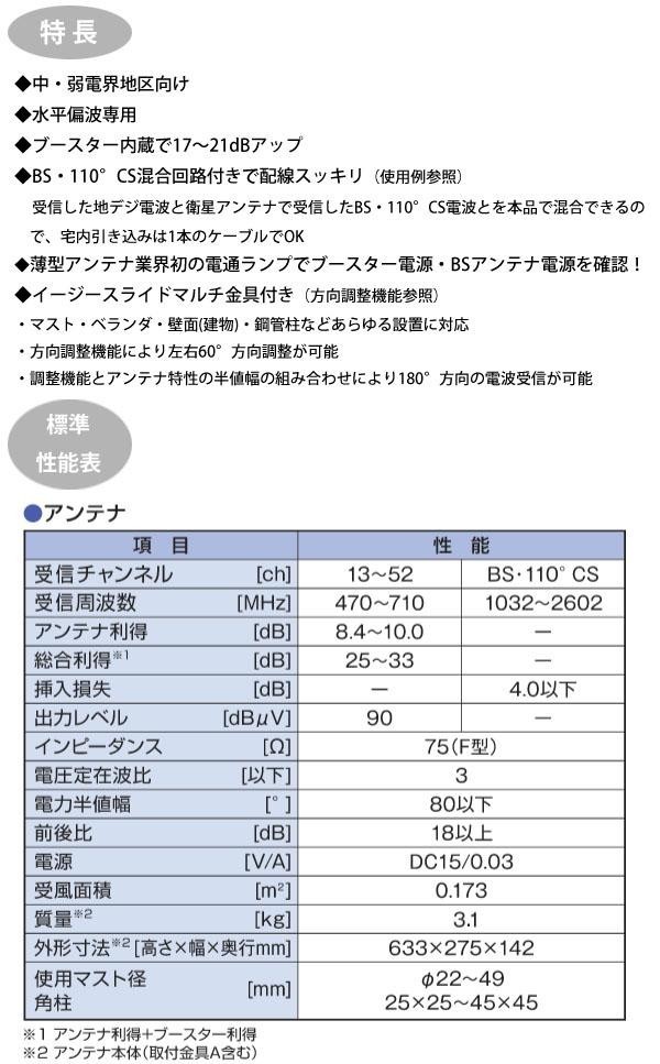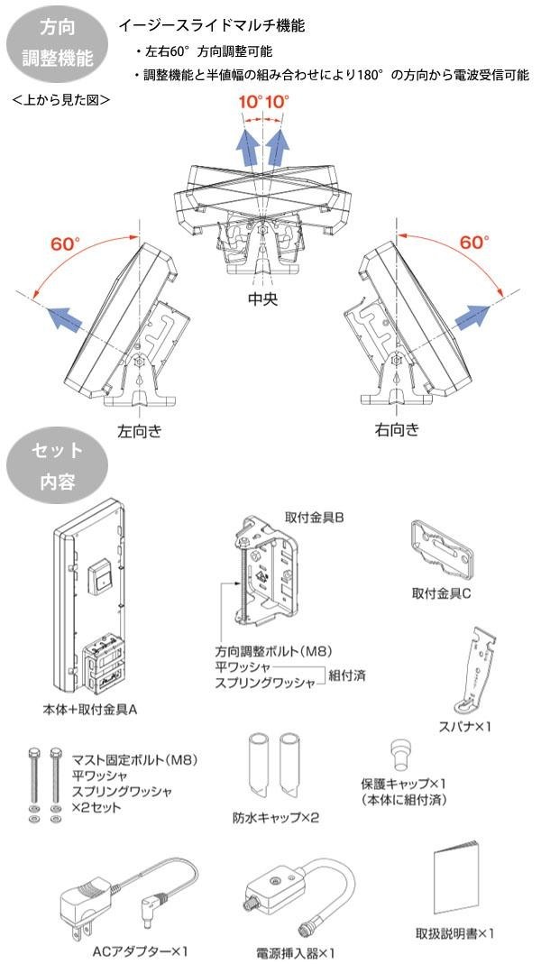イージースライドマルチ金具で色々な場所に設置でき、取付けも簡単です。ブースターを内蔵しているので、アンテナからケーブルを長く配線する時などに有効です。前後比の特性に優れているので、壁面反射波などによる受信不良の問題が生じにくくなっています。 |