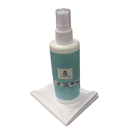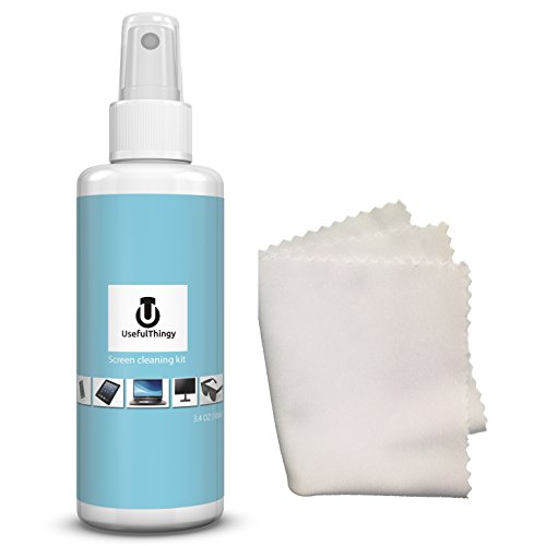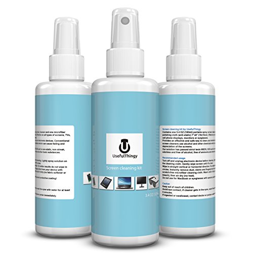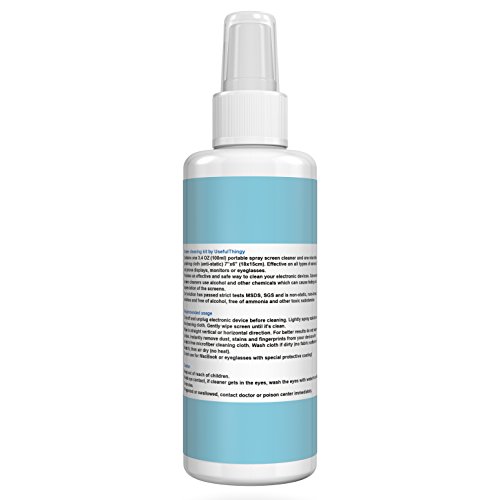 Feature : No streaks - Cleans and removes grease, dust, oils, fingerprints, smears and dirt - safely and efficiently / Wide use - Best for cleaning the screens: TV, phone, laptop, PC computer, Ipad, Kindle, eyeglasses (or sunglasses), camera, touch screens or any other electronics with a screen. We do not recommend using it for MacBook with protective coating! / Kit contains 3.4 OZ (100ml) Portable Spray Screen Cleaner and 1 Microfiber Polishing Cloth (Anti-Static) 7" x 6"(18 x 15cm) / Alcohol-free, ammonia-free and phosphate-free. / 100% Money back guarantee - We are so confident you will like our product that we offer you 30 days money back guarantee!