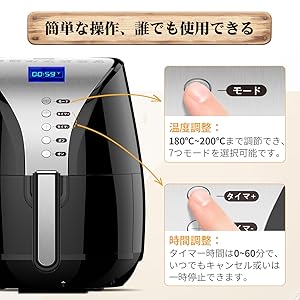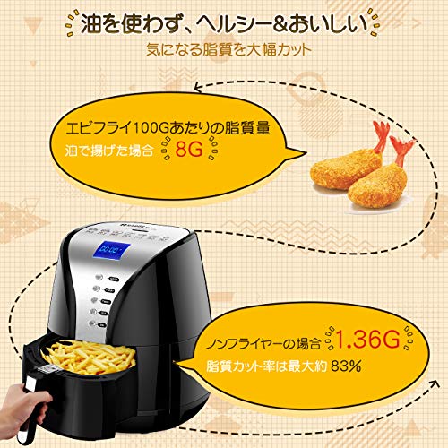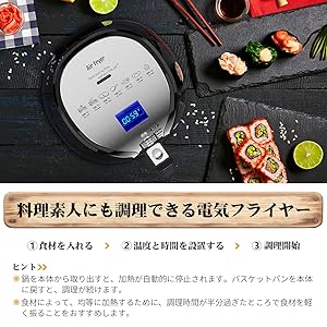 ????お客様はレシピによって、魚のフライや天ぷらなど、日本でもおなじみの揚げ物料理全般を調理することが可能です。ノンフライヤーは脂肪がなく、健康的でおいしい食事と軽食を提供し、グリル、ベーキング、ロースト、油無しでフライをサポートします。ノンフライヤーを使用して、ご家族に健康的で、栄養バランスの良い美味しい料理を振る舞っていただけたら幸いです。