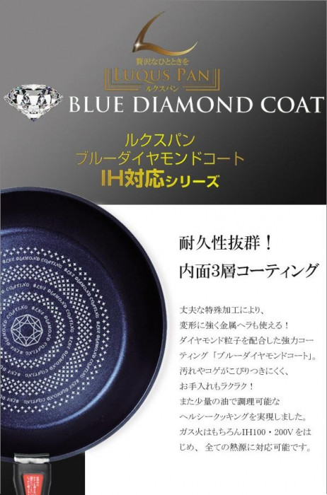 | 丈夫な特殊加工により、変形に強く金属ヘラも使える!ダイヤモンド粒子を配合した強力コーティング「ブルーダイヤモンドコート」が施されています。汚れやコゲがこびりつきにくく、お手入れもラクラク!また、少量の油で調理可能なヘルシークッキングを実現しました。ガス火はもちろん、IH100・200Vをはじめ、全ての熱源に対応可能です。 |