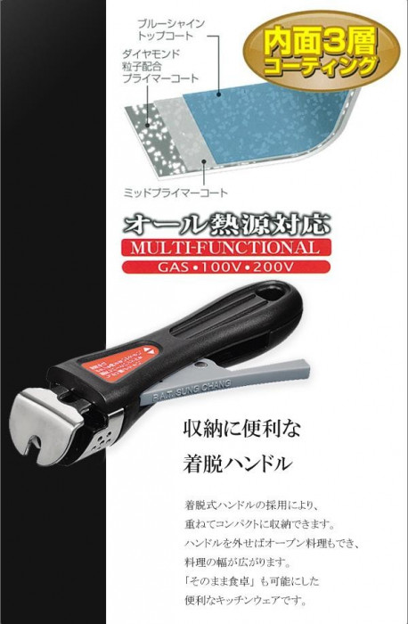丈夫な特殊加工により、変形に強く金属ヘラも使える!ダイヤモンド粒子を配合した強力コーティング「ブルーダイヤモンドコート」が施されています。汚れやコゲがこびりつきにくく、お手入れもラクラク!また、少量の油で調理可能なヘルシークッキングを実現しました。ガス火はもちろん、IH100・200Vをはじめ、全ての熱源に対応可能です。 |