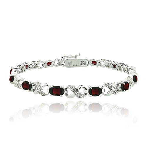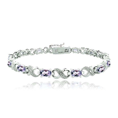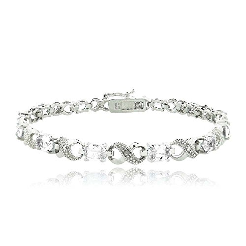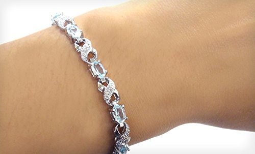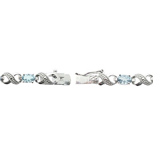 This attractive bracelet represents your everlasting relationship with the infinity links it showcases. The infinity design is separated by oval blue topaz stones. One genuine diamond is pave set in the midst of dotted pave detailingâ€TMs; simulating shimmering stones. The bracelet is secured by a box tongue with a safety latch. Diamond has less than 17 facets.