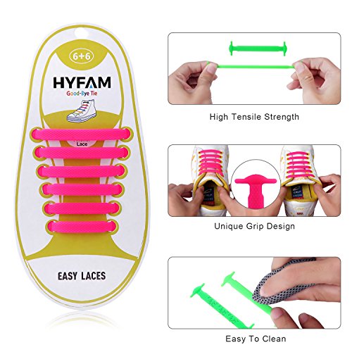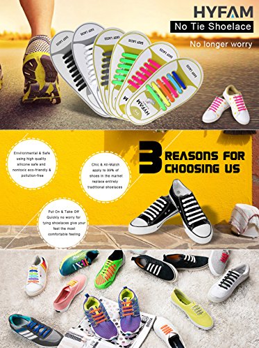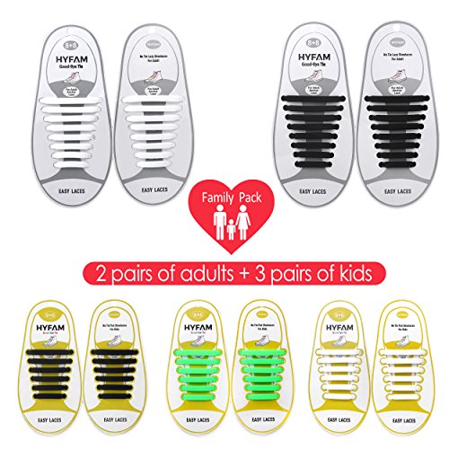 Whoever is having troubles with shoelaces, let's say goodbye to traditional shoelaces: Hyfam No Tie Shoelace! Giving you a convenient life! Features: Made of high quality food-grade silicone, safe and nontoxic. 2 pairs for adults, 3 pairs for kids. Easy to clean. Simply wipe them with a wet rag. Adjust tightness according to your footwear. Add personality to your shoes.