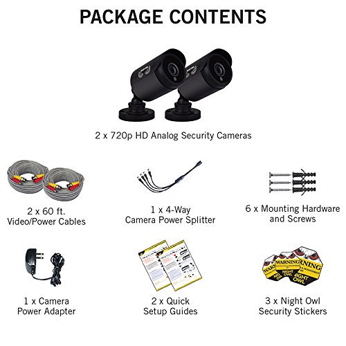 -. Binding : Electronics -. Brand : Night Owl -. Color : Black -. EAN : 0810830023113 -. Feature : Want to expand and add cameras to your Night Owl Security DVR System? Purchase this 2 pack of 720p HD Wired Security Cameras and view your video in 720p HD! / Night Owl's unique HD Analog series technology is also backwards-compatible with existing analog cabling. / These 720p HD bullet cameras feature a 70˚ field of view over the standard 42˚ view of most cameras / Night Owl HD Analog 720p wired cameras come equipped with a 3-axis vandal-proof mounting bracket. / At Night Owl, our goal is to provide an incomparable experience for any technical support required. -. Format : CD-ROM -. Label : Night Owl -. Manufacturer : Night Owl -. Model : CAM-2PK-7HDA-BB -. MPN : CAM-2PK-7HDA-BB -. OperatingSystem : N/A -. PackageQuantity : 1 -. PartNumber : CAM-2PK-7HDA-BB -. ProductGroup : Photography -. ProductTypeName : SURVEILANCE_SYSTEMS -. Publisher : Night Owl -. Studio : Night Owl -. Title : Night Owl Security, 2 Pack of 720p HD Wired Security Add-on Bullet Cameras (Black) -. UPC : 810830023113