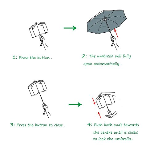 -. Feature : 1.Water-resistant MATERIAL - Features lightweight, mildew-resistant, and quick-drying polyester / 2.Automatic opening and closing operation. Only one button can be opened or closed in one second. / 3.The rubberized ergonomic handle - fluted design provide better grip experience and help to reduce wrist fatigue / 4.DIMENSIONS: Closed Length: 11.5 in., Open Length: 22.5 in., Canopy Arc: 42 in., Coverage Diameter: 37 in., Weight 14.5 oz. / 5. Superior Quality Umbrella-Premium materials and workmanship including high-density water-repellent and UV sun protective fabric closing folding safety telescopic rod of compact wind proof travelling umbrella