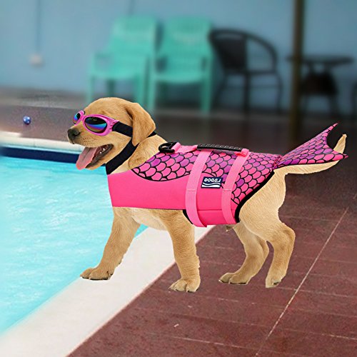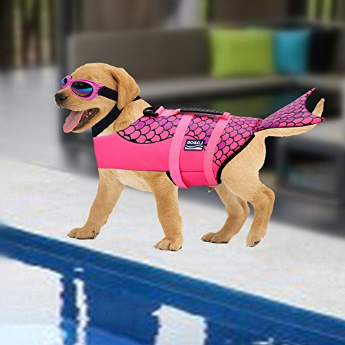 -. Title : Large Dog Life Jacket Fish Style Floatation Vest with Pet Dog Sunglasses WaterProof Protection Goggles