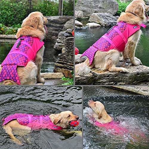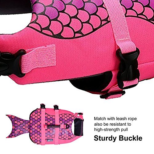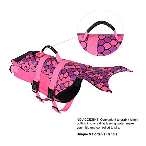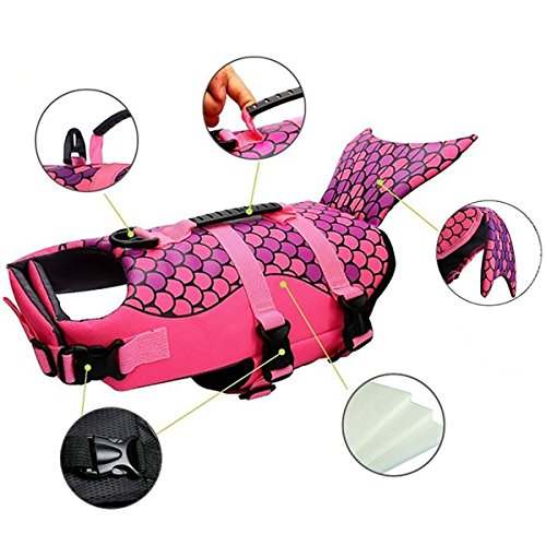 -. Feature : Adjustable nylon straps,quick-release buckles,and velcro on the neck and belly ensure the perfect fit / Has a unique portable handle,very easy to control your little pet / Equipped with a thicker neck strap,effectively prevent your dog's head into the water,safe and comfortable / Mermaid style life jacket make your pet become the star while swimin,walking and other water based activities / The life vests allow long playtime in the water and keep your pup safely equipped for every new adventure!