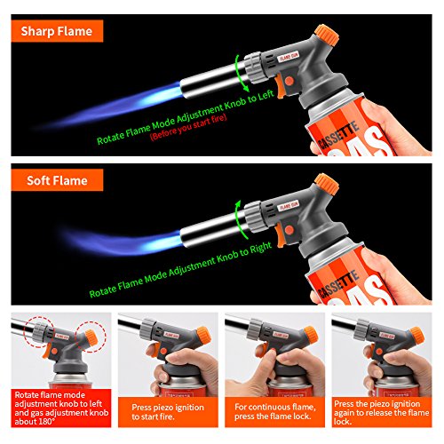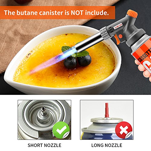 EASY TO OPERATE: Install the butane canister to the kitchen torch, rotate gas adjustment valve about 90°then ignite. Press the flame lock for steady flame.