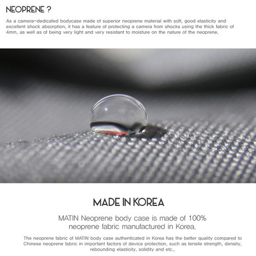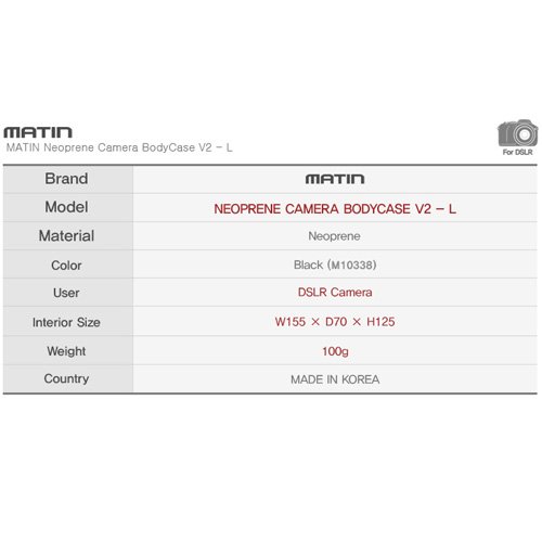 -. Binding : Camera -. Brand : MATIn -. Color : Black -. EAN : 8809030165367 -. Feature : Genuine Matin Brand New. / For Medium or Large SLR Camera Body / V2 New Upgraded Version / 4mm - Thick Neoprene Elastic material use / Water-Resistant, Extremely soft, Elastic and Shork-proof Case / Dimensions: W155 x H125 x D70mm, Made in Korea -. Label : Matin -. Manufacturer : Matin -. Model : M-10338 -. MPN : M-10338 -. PackageQuantity : 1 -. PartNumber : M-10338 -. ProductGroup : CE -. ProductTypeName : CAMERA_BAGS_AND_CASES -. Publisher : Matin -. Studio : Matin -. Title : Matin Digital SLR Compact Camera Body Case Black V2 - (Large) New Upgraded Version