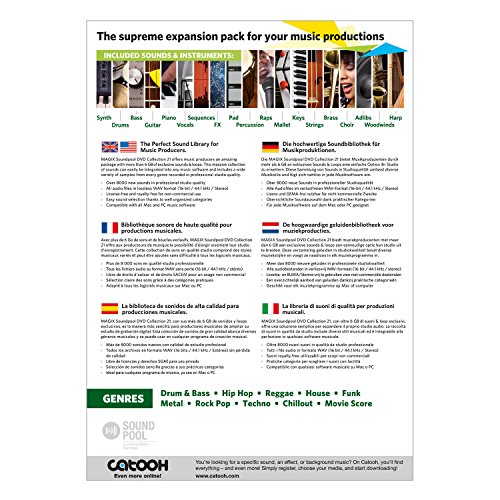 The Perfect Sound Library for Music Producers. MAGIX Soundpool DVD Collection 21 offers music producers an amazing package with more than 6 GB of exclusive sounds & loops. This massive collection of sounds can easily be integrated into any music software and includes a wide variety of samples from every genre recorded in professional studio quality.Feature
