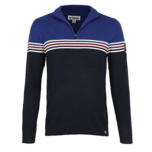 Binding : Apparel Product Description A touch of retro striping with a modern fit and design makes Meisters Toby Sweater an ageless piece A quarter zipper closes up the ribbed collar to keep things neat and clean The felted hem label and embroidered sleeve patch finish off with a little accenting 50pct Merino/50pct Anti Pilling Acrylic fabric 1/4 zip for easy on/off Embroidered Meister patch on sleeve Multi color stripes on sleeve and chest 0