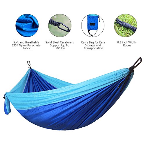 Easy to Set Up: There is everything you need for quick and easy hanging setup. It will take less than 3 minutes to hang your camping hammock on a tree or nearby objects by using the included ropes, strips and carabiners.