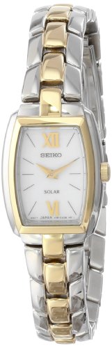 Two tone stainless steel tonneau case is water resistant. Brushed and polished link bracelet secures the watch to your wrist. Classic white dial is well accented by gold tone hands and hour markers. Solar powered Quartz storing power from any available light. The scratch resistant Hardlex crystal protects the water resistant case.