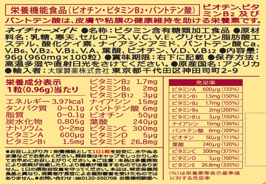 栄養成分 : 1粒(0.96g)当たりエネルギー/3.98kcal、タンパク質/0〜0.1g、脂質/0〜0.1g、炭水化物/0.806g、ナトリウム/0〜2mg、ビタミンA/600μg、ビタミンB1/1.5mg、ビタミンB2/1.7mg、ビタミンB6/2mg、ビタミンB12/3μg、ナイアシン/15mg、パントテン酸/6mg、葉酸/200μg、ビオチン/30μg、ビタミンC/300mg、ビタミンD /5μg、ビタミンE/26.8mg