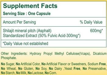 -. Feature : 60 Vegitarian Capsules / Serving Size: 1 capsules / 60 Servings Per Container / Shilajit Minaral Pitch(Asphalt) 600mg / Standerdized Extract(50%Fulvic Acid-300mg)