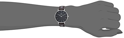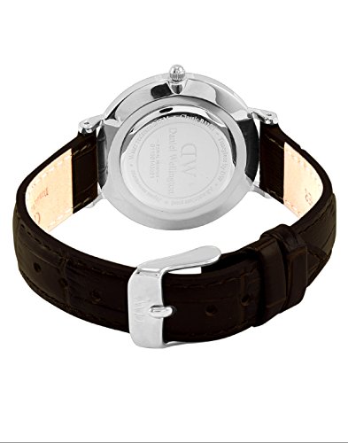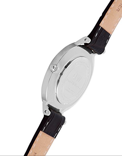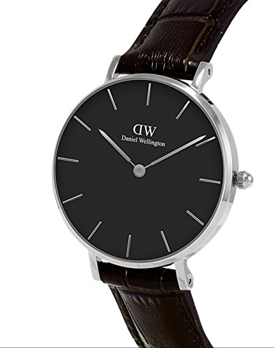 Stainless steel case with a dark brown leather strap. Fixed stainless steel bezel. Black dial with silver-tone hands and index hour markers. Dial Type: Analog. Quartz movement. Scratch resistant mineral crystal. Pull / push crown. Solid case back. Case size: 32 mm. Case thickness: 6 mm. Round case shape. Band width: 14 mm. Tang clasp. Water resistant at 30 meters / 100 feet. Functions: hour, minute. Casual watch style. Daniel Wellington Classic Petite York Ladies Watch DW00100182.Feature