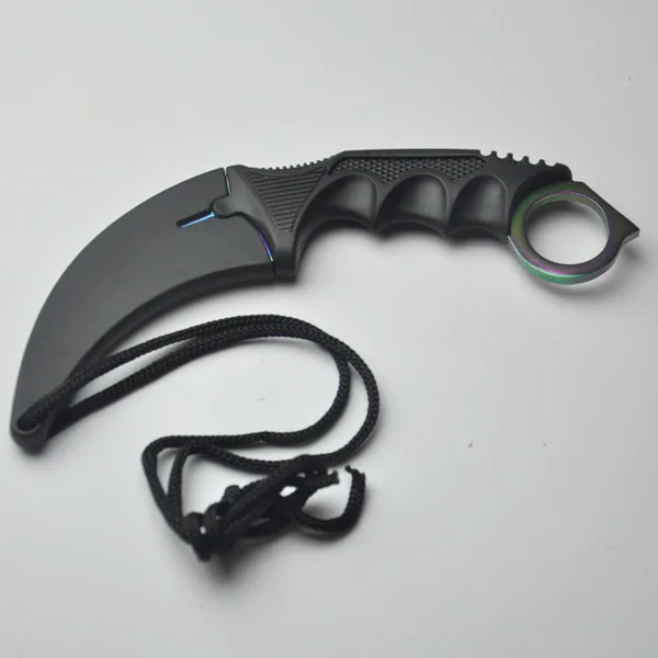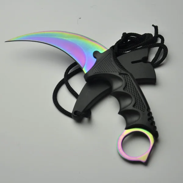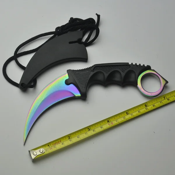 유형: 고정 블레이드 나이프 색상: 무지개 색 전체 길이: 18.8 센치메터 블레이드 길이: 9 센치메터 핸들 길이: 12 센치메터 블레이드 폭: 3 센치메터 핸들 폭: 4 센치메터 블레이드 두께: 0.38 센치메터 핸들 두께: 1.6 센치메터 블레이드 재질: 스테인레스 스틸 핸들 재질: 플라스틱 칼 무게: 106.5 그램 총중량: 145.5 그램 칼집: 플라스틱 + 로프