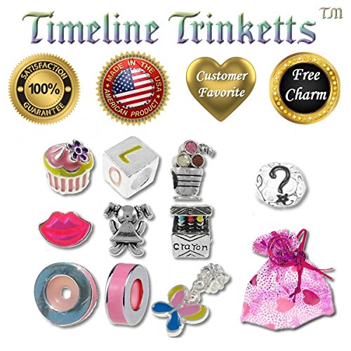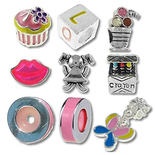 - 9 PACK spacers exactly like those pictured and no duplicates. Designs include two silicone stopper o ring safety charms, Neopolitan ice cream soda with strawberry, chocolate, and vanilla rhinestones, red crayon box, little girl, blue enamel butterfly pendant, LOVE cube, hot pink lips, and yellow cupcake shapes. Great for kids incentive, chore, school, or homeschool rewards. Beautiful for a graduation and Easter charm bracelet accessory.