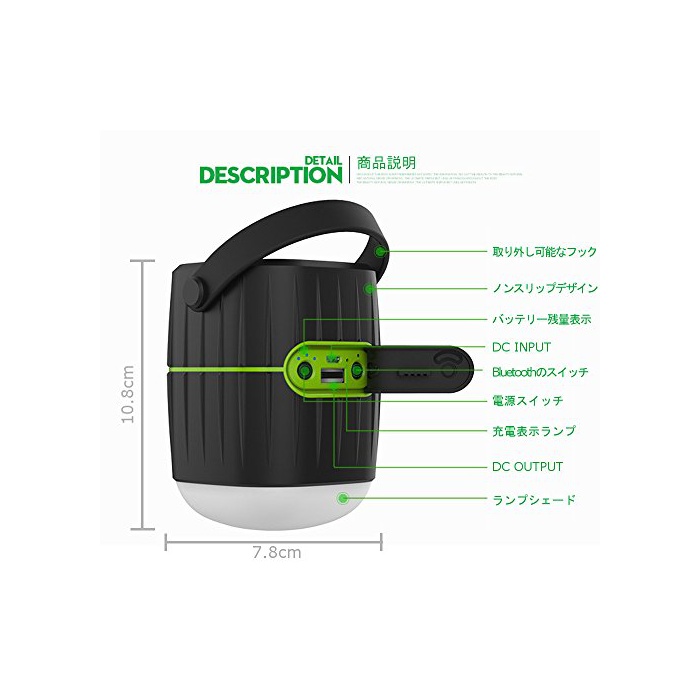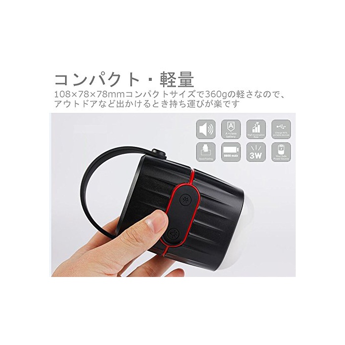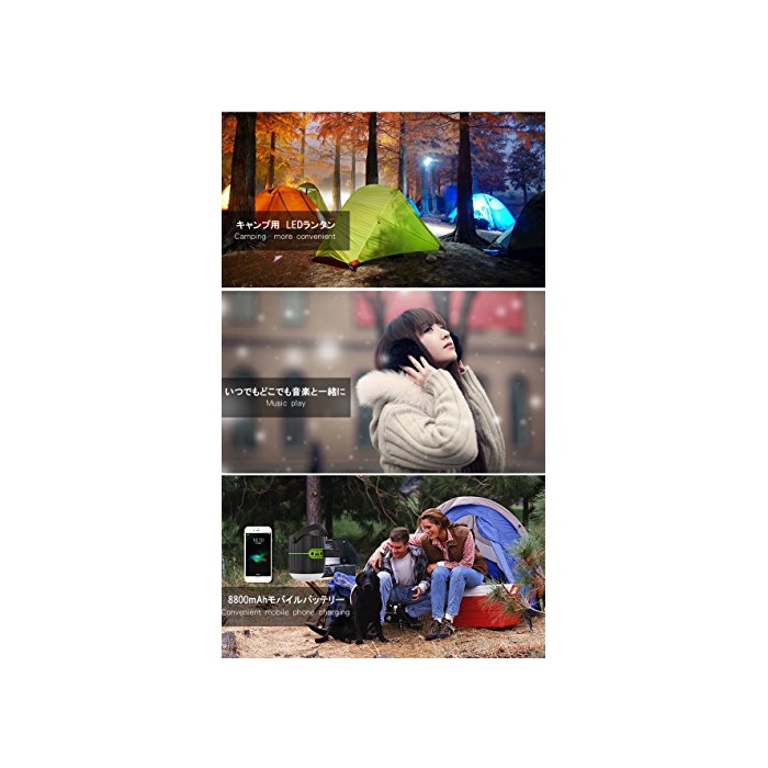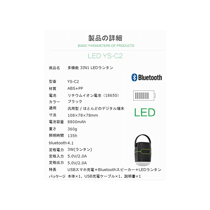 【3 IN 1】①3W 고휘도 LED 랜턴②포터블 Bluetooth4.1 스피커③8800mAh 대용량 모바일 배터리 3개의 기능을 가득 처넣었다 콤팩트 사이즈의 아웃도어 랜턴입니다.
